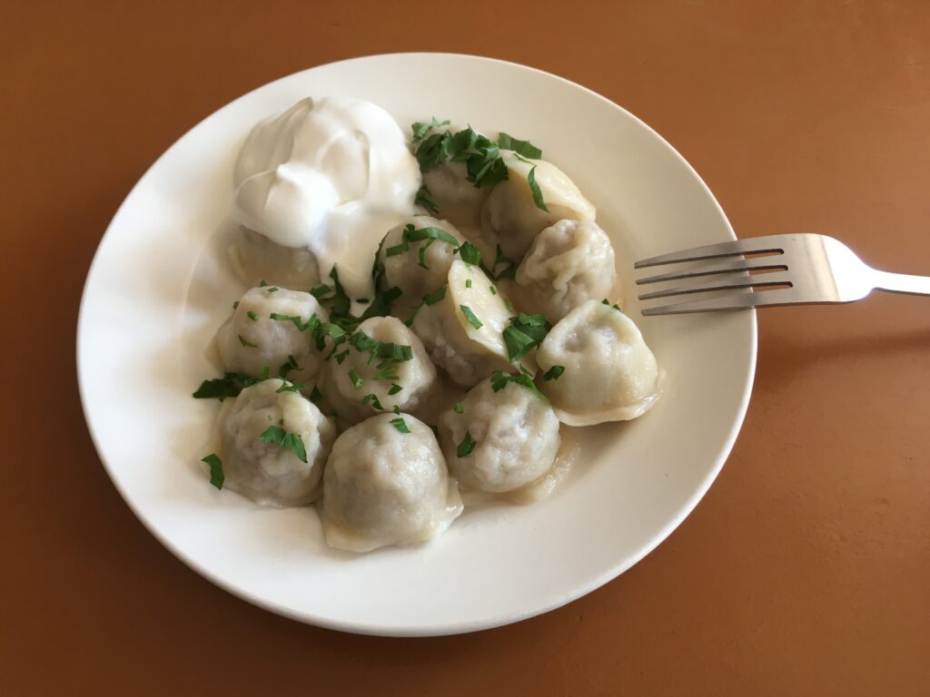 着いたらまずはランチにロシア名物のペリメニ(ロシア風水餃子)を食べる。ロシアではサワークリームをつけて食べるのが一般的。