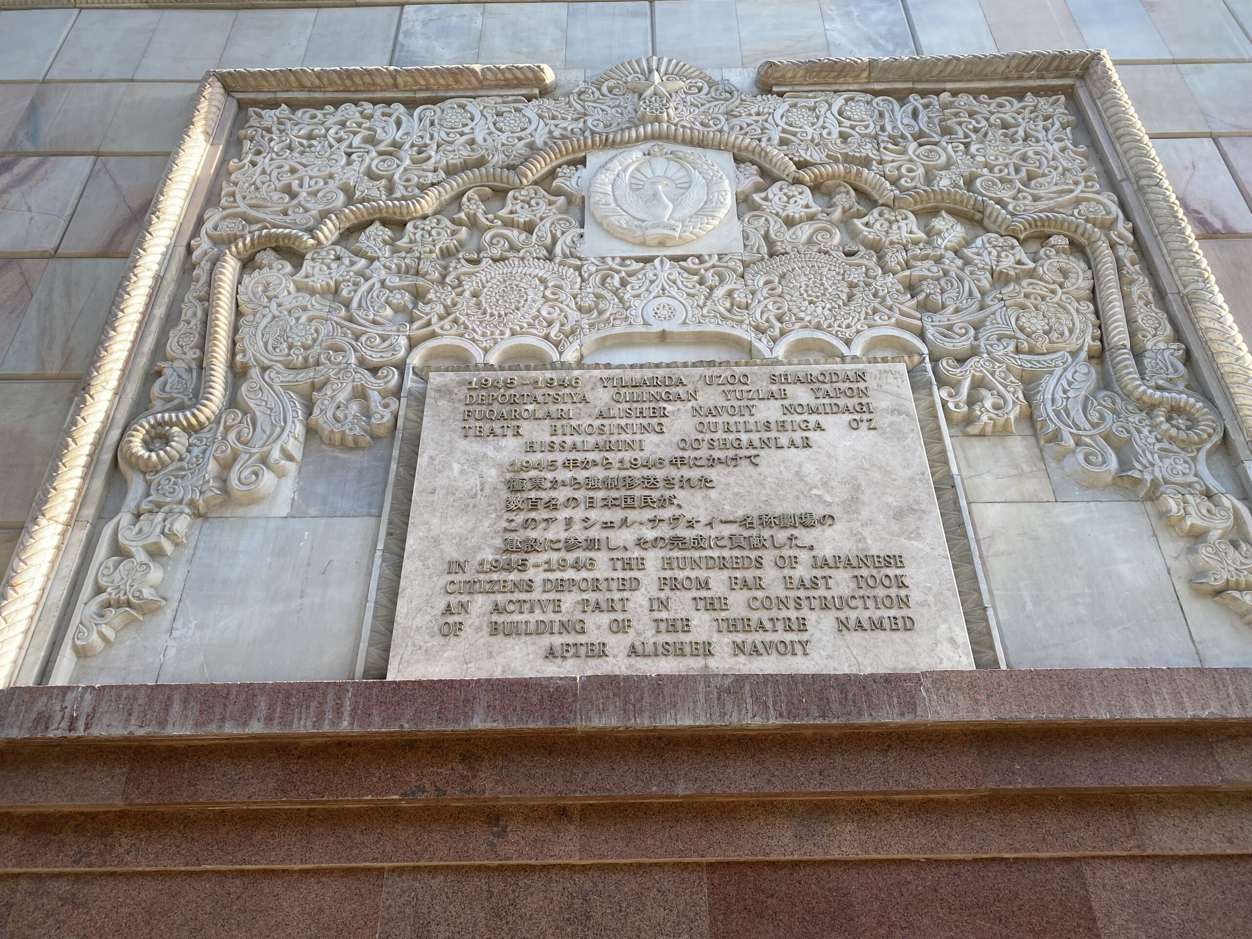 「1945年から1946年にかけて極東から強制移送された数百名の日本国民が、このアリシェル・ナヴォイー名称劇場の建設に参加し、その完成に貢献した。」と書かれたプレートが残っています。