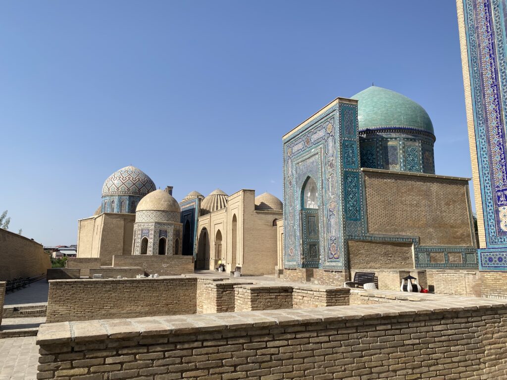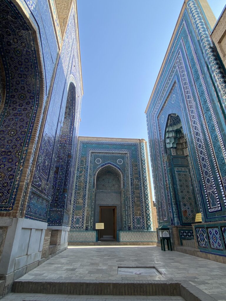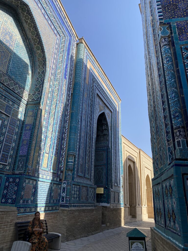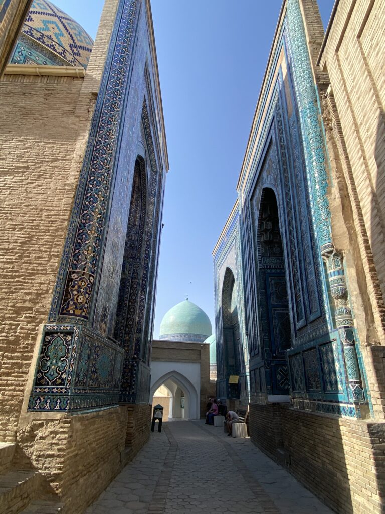 まずはシャーヒズィンダ廟群へ。ここはティムールゆかりの人々の霊廟が立ち並ぶ場所で、サマルカンドブルーを最も実感できる場所を言われています。
